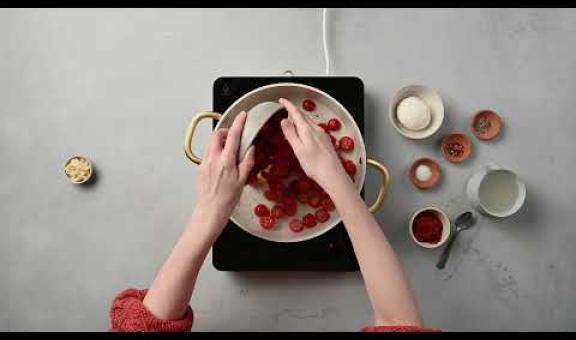 Samaan aikaan pastan kypsyessä: paista tomaatteja ja valkosipulia öljyssä isossa paistinpannussa keskilämmöllä, kunnes ne ovat pehmentyneet. Lisää tomaattipyre, pastan keitinvesi, suola, chilirouhe ja mustapippuri. Revi joukkoon yksi burratajuusto. Anna hautua miedolla lämmöllä, kunnes juusto on sulanut. Lisää hienonnettu basilika.