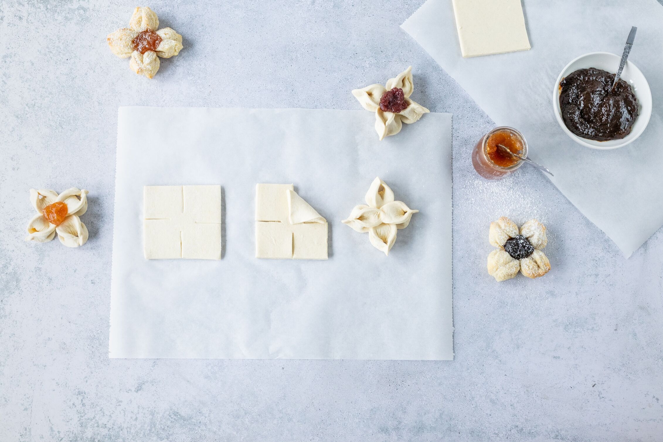 Kukkatorttu: Taita neliskanttinen torttulevy kulmittain kolmioksi. Leikkaa pitkän sivun molempiin reunoihin viillot (noin 3 cm). Avaa torttu ja taita se toiseen suuntaan kolmioksi. Leikkaa samalla tavoin viillot (noin 3 cm) myös näin päin pitkän sivun reunoihin. Avaa torttu ja yhdistä vastakkaiset kulmat keskelle torttua ja tee sama vielä toisille vastakkaisille kulmille. Paina kaikki kulmat hyvin yhteen.