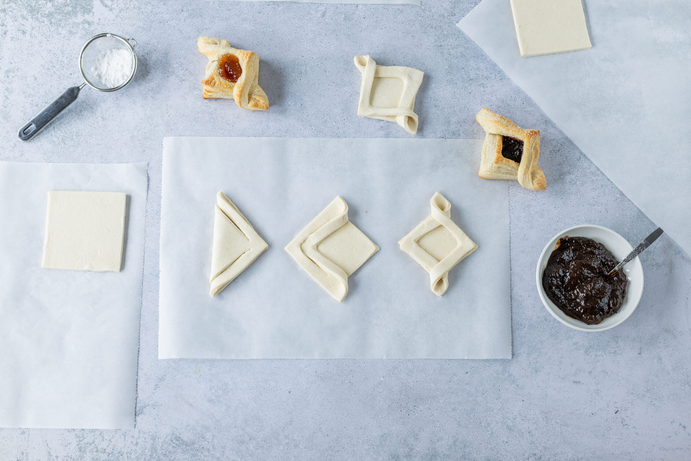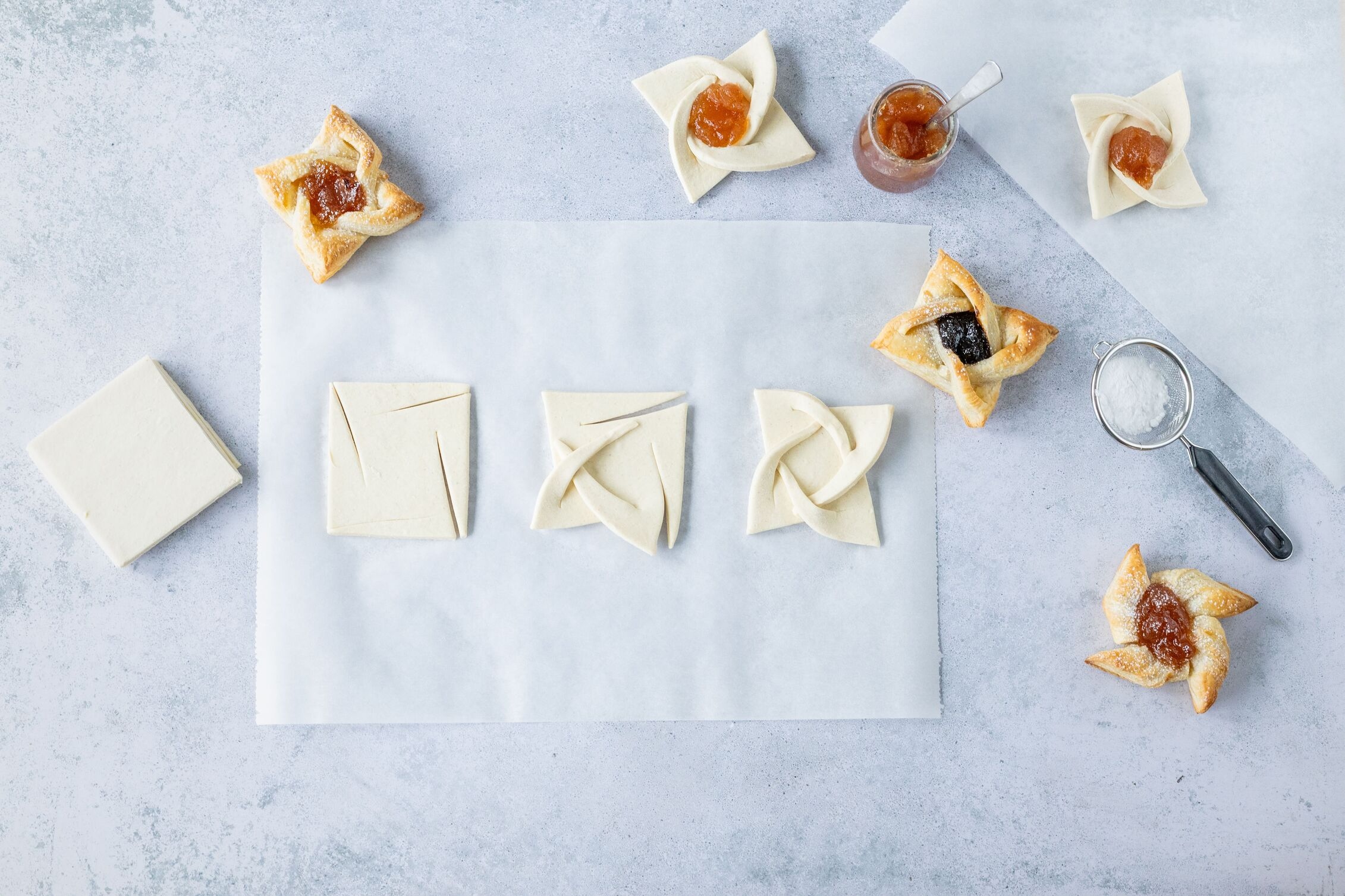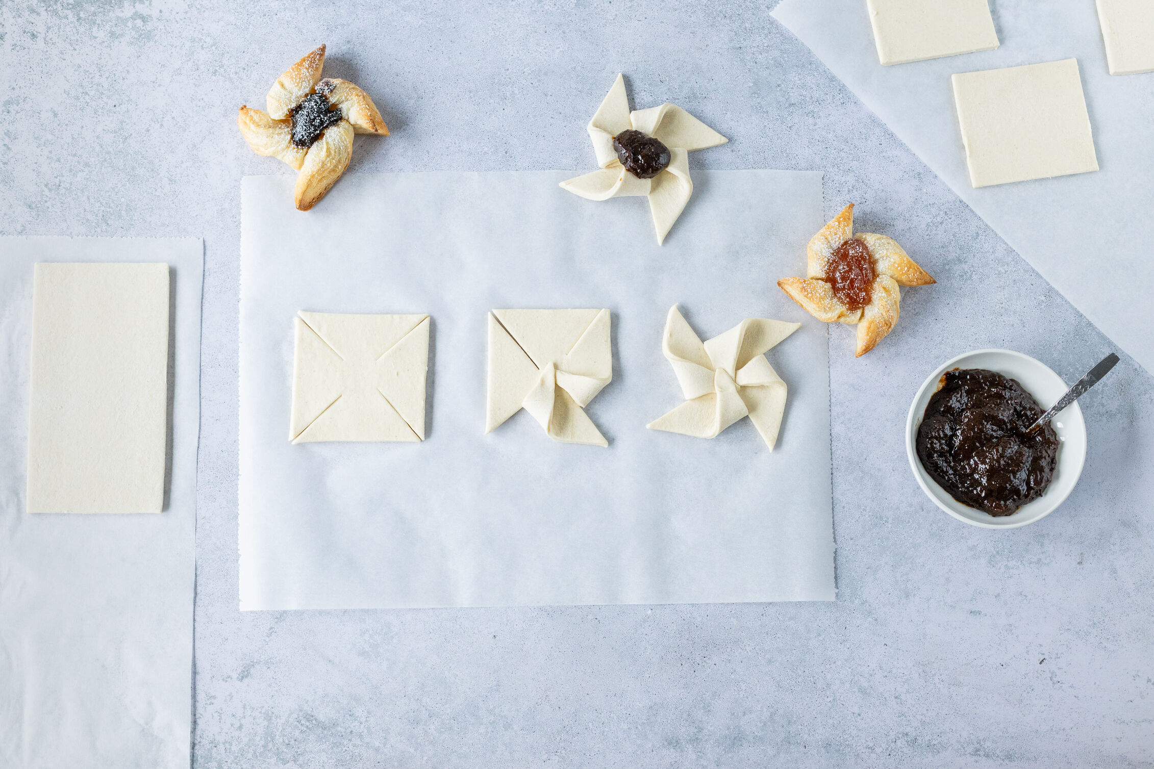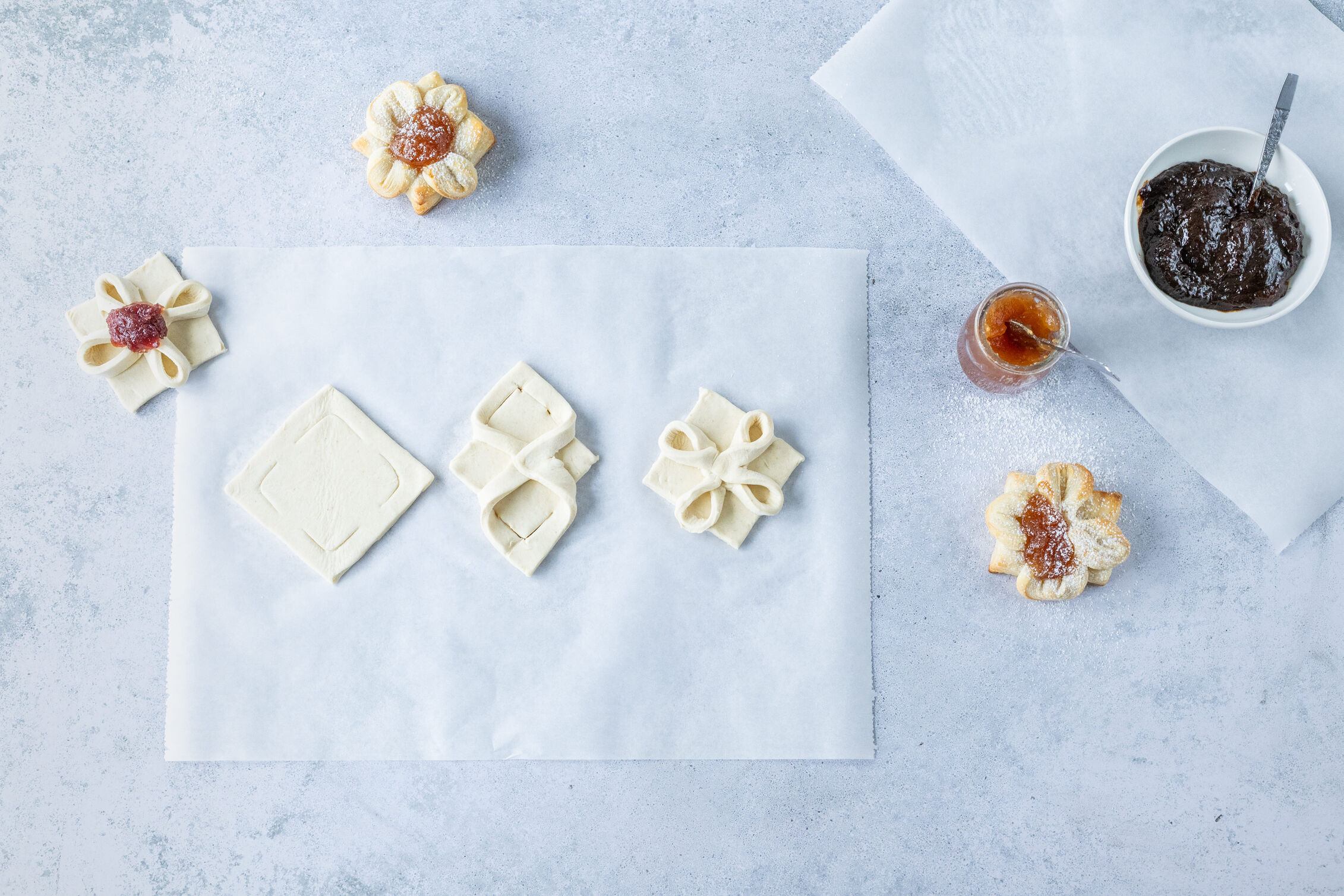Tähtitorttu: Leikkaa jokaisesta kulmasta viillot neliskanttisen torttulevyn keskiosaa kohden. Jätä kuitenkin viiltokohdat keskeltä yhteen. Taita joka toinen kulma tortun keskelle kiinni.