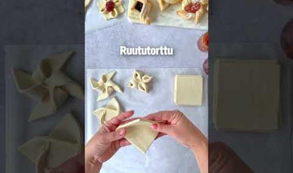 Ruututorttu: Taita neliskanttinen torttulevy kulmittain kolmioksi. Leikkaa molempiin reunoihin pitkät viillot kohti kolmion terävää kärkeä. Jätä viillot kuitenkin vajaiksi, jotta torttu pysyy yhtenäisenä. Avaa taikinalevy ja ota irtileikatuista kulmista kiinni. Pujota toinen kulma toisen ali ja paina kulmat vastakkaisiin kulmiin kiinni.