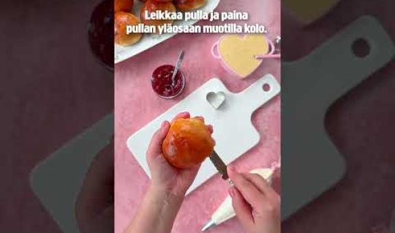 Leikkaa jäähtyneistä pullista yläosa irti. Paina yläosaan muotilla sydämenmuotoinen kolo. Levitä pullan alaosalle ensin hilloa. Pursota hillon päälle kermavaahtoa, mutta jätä keskelle pieni kolo. Lusikoi keskelle jäävään koloon jäähtynyttä vaniljavanukasta. Laita yläosa takaisin täytetyn pullan päälle. Lusikoi koloon vielä joko hilloa tai vaniljavanukasta, oman maun mukaan. Siivilöi halutessasi vielä tomusokeria pullien päälle.